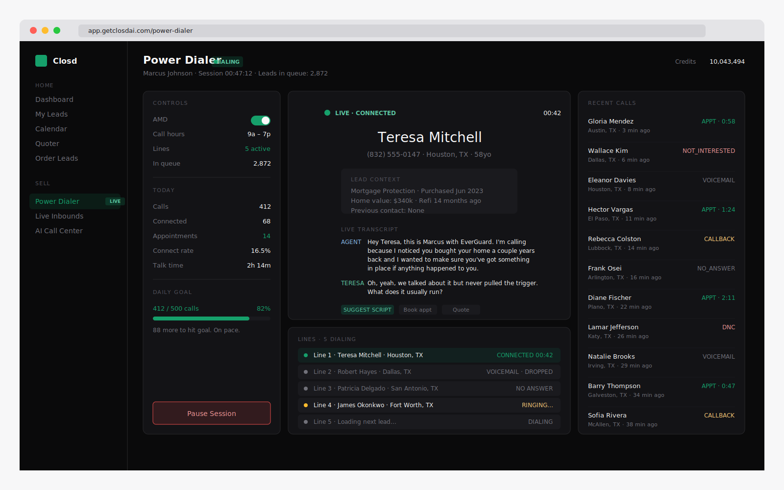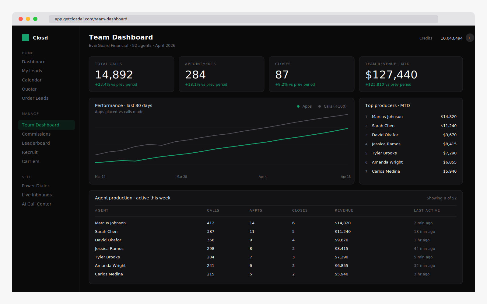 I run EverGuard. Fifty-plus agents, forty-nine states. I spent years on that hamster wheel before I built Closd to run my own shop. Not as a side project. As the thing my agency actually runs on, every day. Other agency owners started asking what I was using. This is what I was using.