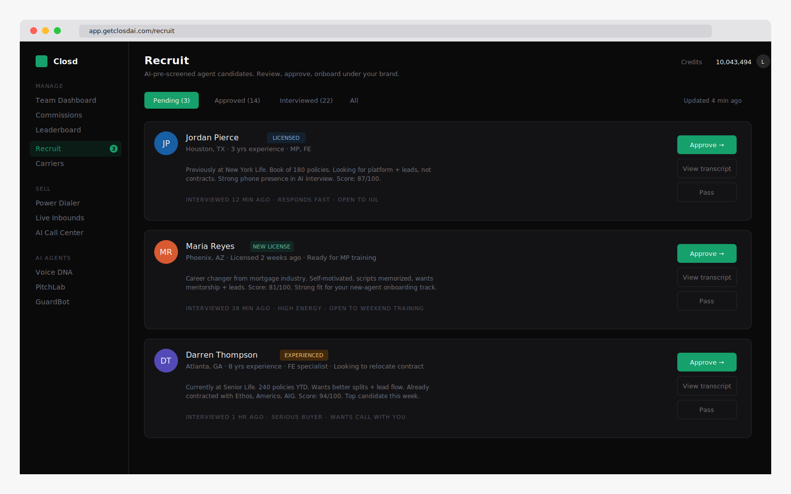Recruit has three candidates waiting for you. Pre-screened. Interviewed by AI before they hit your inbox. You tap approve on the one you like and he's onboarded under your brand, your domain, your colors, by lunch. Not two weeks. Lunch.