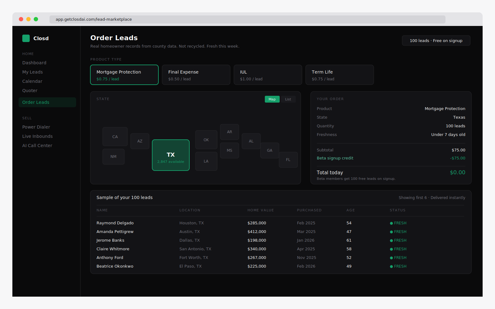 Day one, you log in and 100 real leads are already loaded in your pipeline. Not recycled internet junk. Real homeowner records from county data, in the state you chose, at the price point you can work.
