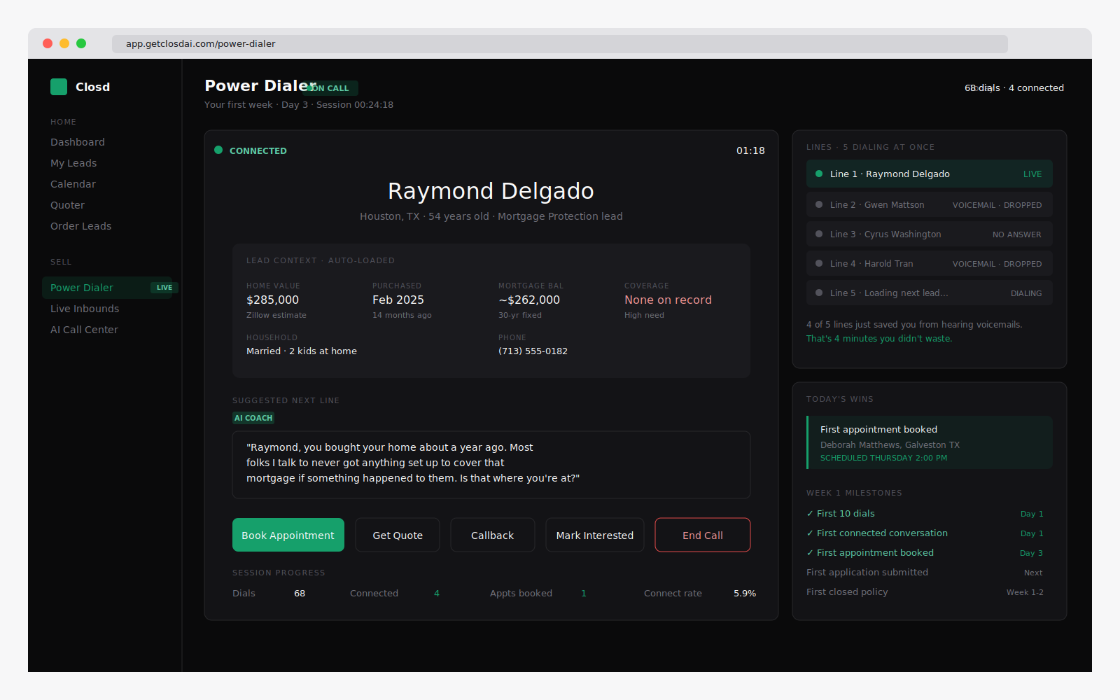 You're up at 7. On the phone by 8. You dial your list one number at a time. Voicemail. Voicemail. Disconnected. Not interested. No answer. Wrong number. You leave a voicemail that you already know nobody's calling back from. By noon you've dialed 60 leads and talked to four humans. Two of those four said no before you finished the first sentence. One said "send me information" which you already know means no. One said "call me tomorrow" which you already know means no.