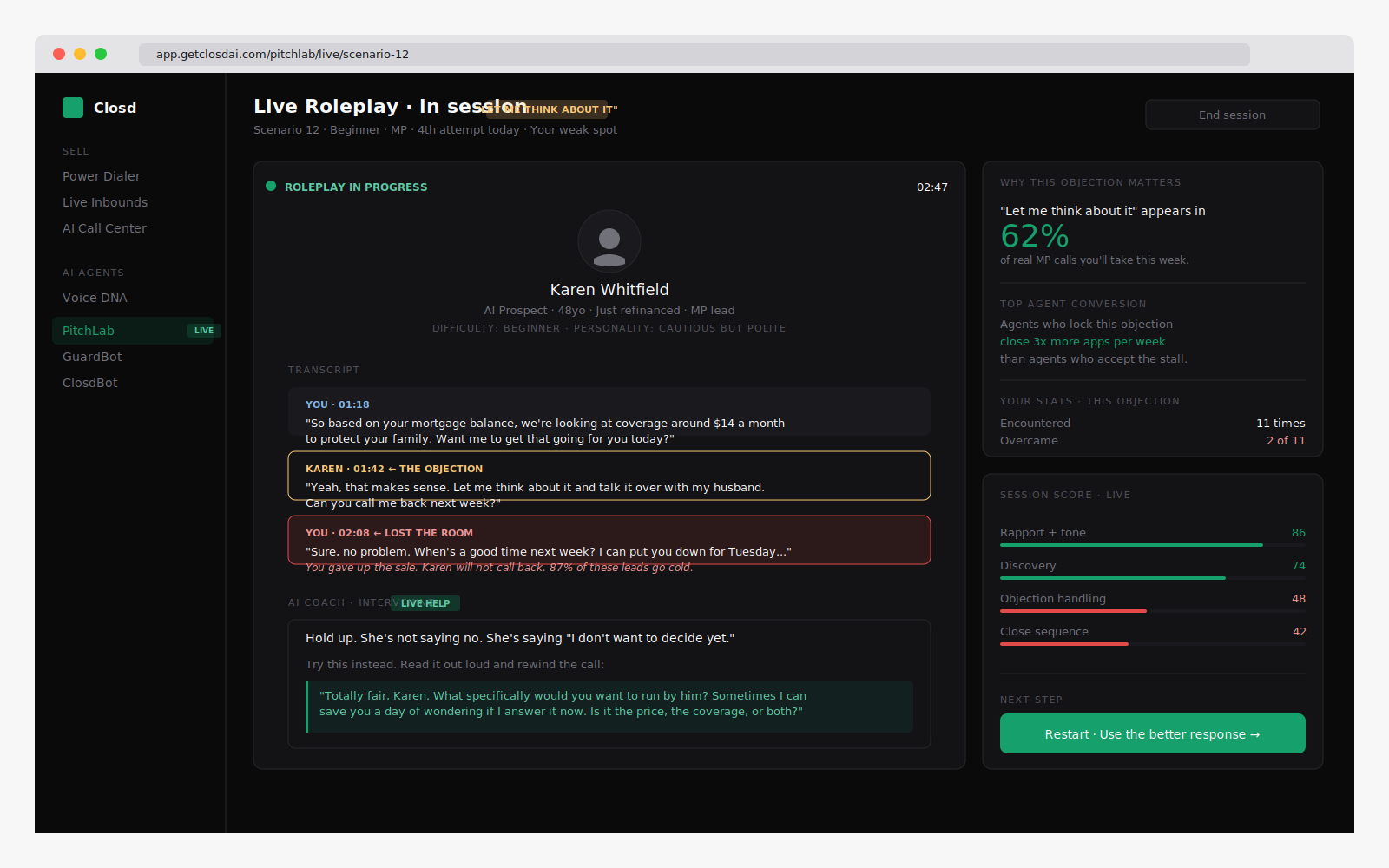 Before your next call block, you run a Pitch Lab session. A hard objection, a real AI prospect, scored after you hang up. The exact thing you fumbled on last week, you drill until it's clean. You don't burn real leads learning how to handle "let me think about it." You handle it in roleplay at 7am and it never trips you up live again.